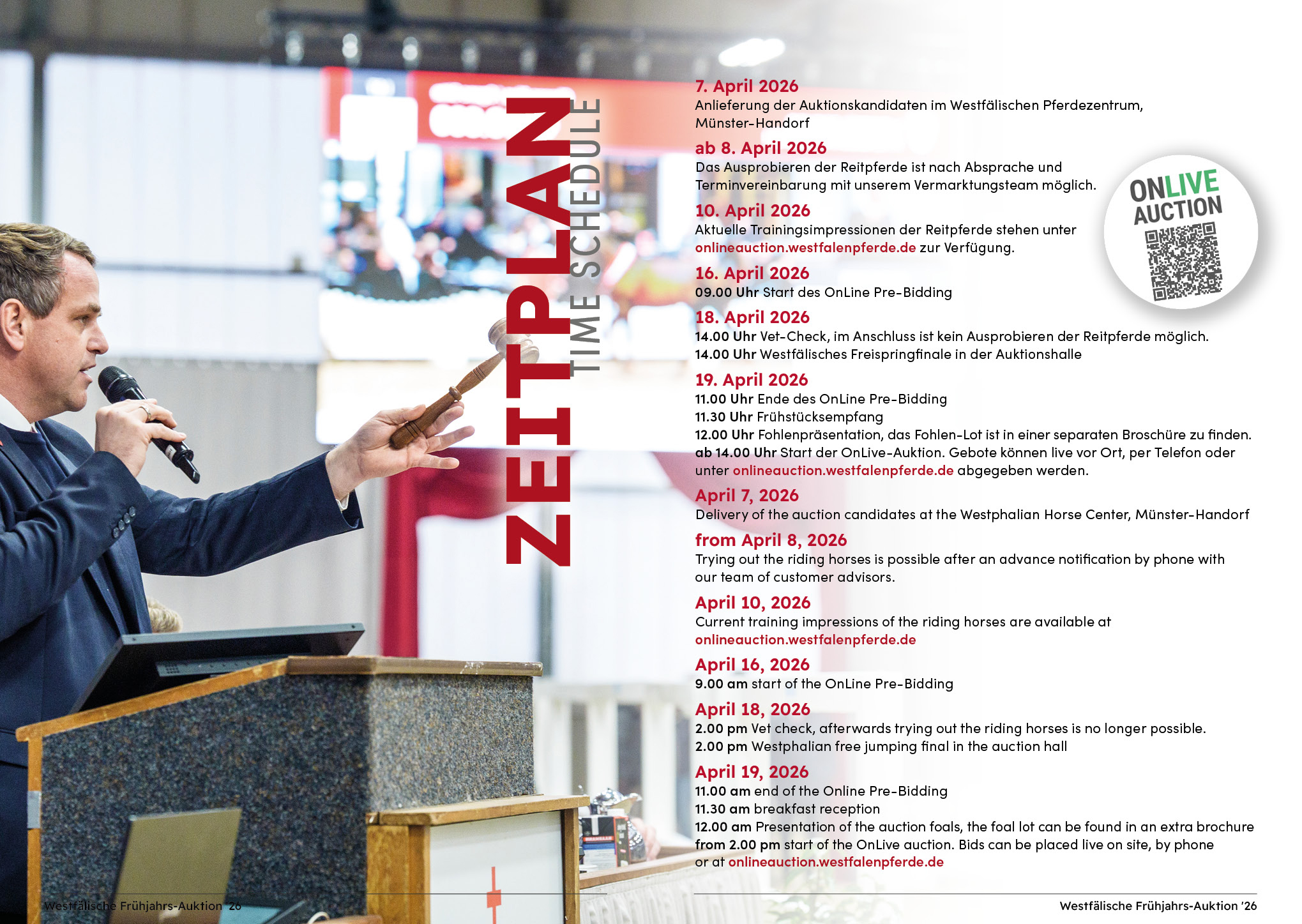 Am 19. April 2026 um 14:00 Uhr (MEZ) beginnt die ONLIVE® Auction. Sie findet beim Westfälischen Pferdestammbuch in Münster-Handorf statt und wird gleichzeitig live online übertragen. Jedes Lot wird einzeln aufgerufen – beginnend mit dem letzten Gebot aus der Pre-Auction. Sie können persönlich in der Auktionshalle oder live online in Echtzeit mitbieten. In dieser Phase wird entschieden, wer das finale Gebot erhält (der Zuschlag).